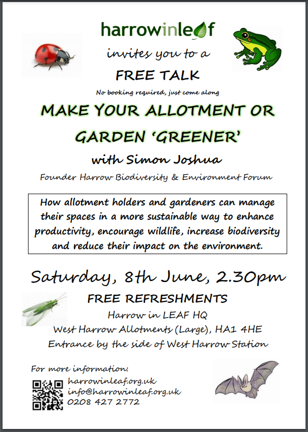A free talk on Saturday 8th June at 2.30pm at Harrow in LEAF HQ, West Harrow Allotments (Large).
